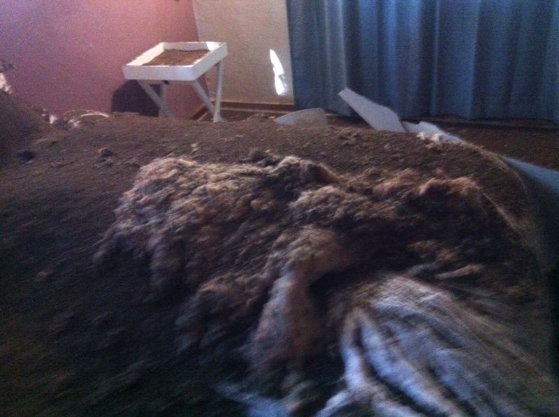 Steven had come back from trail that morning and wanted to put his bags in the bedroom. Before he even opened the door he could already smell it. Bat poop, and lots of it. When he got inside and had a closer look, there it was. What we had feared had actually happened… the ceiling had collapsed onto our bed. The whole room was a gigantic mess of ceiling- and insulation material, bat poop and bats. It was a catastrophe. Or rather a batastrophe!