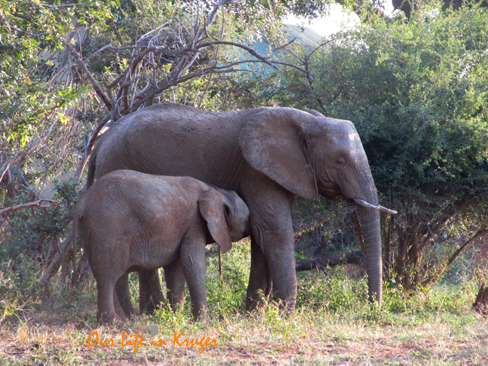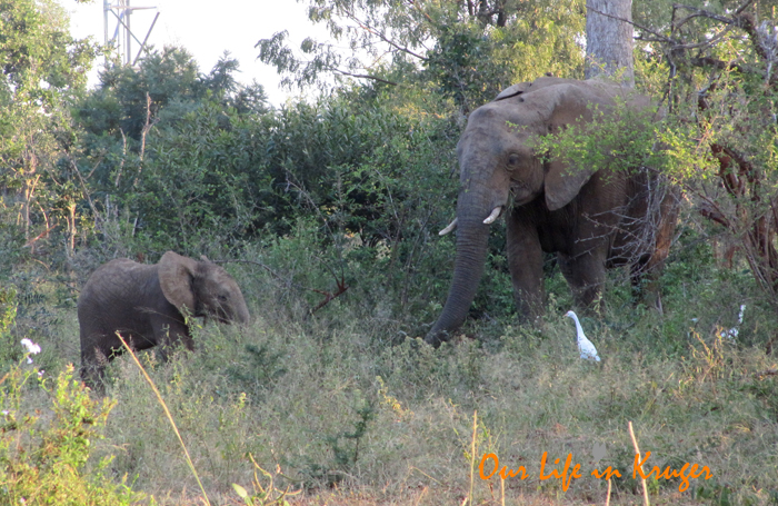 Just outside our front gate, a breeding herd of elephants appeared. They did not seem to be bothered at all by the children being a bit loud and rowdy. The older cows were feeding contently on the trees in front of our garden, while two boisterous youngsters we having a bit of a wrestling match. They were head to head, pushing each other back and forth while trumpeting and making all sorts of noise. One of their mothers seemed to try and calm them down with a low tummy rumble.