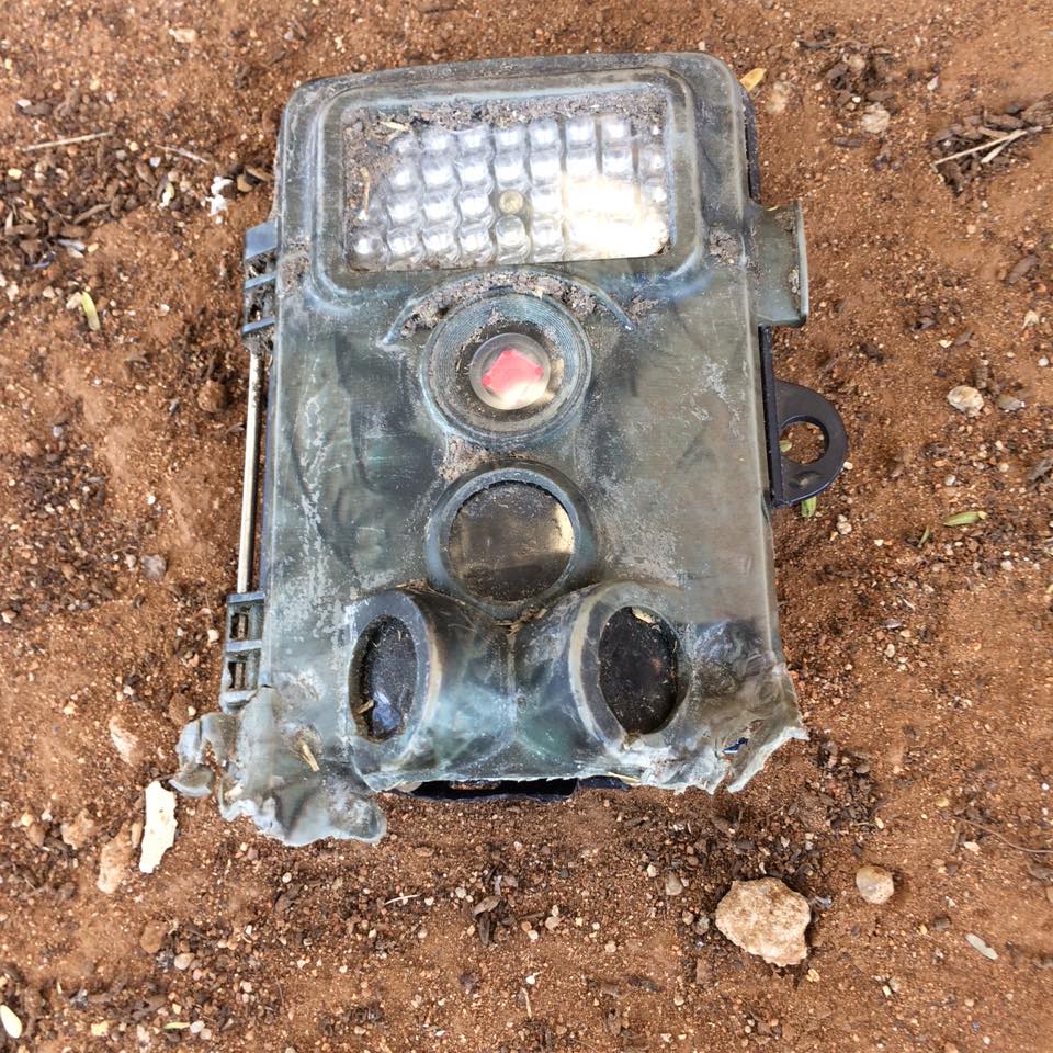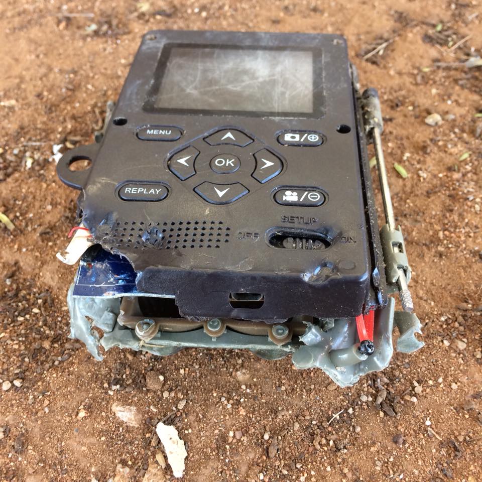 Oh my. It was in terrible shape. It was only the top half that Moses found about 50 meters from the tree it had been on. And it was badly chewed up. The casing chewed open and unfortunately, there was a big chunk of the memory card missing too.
