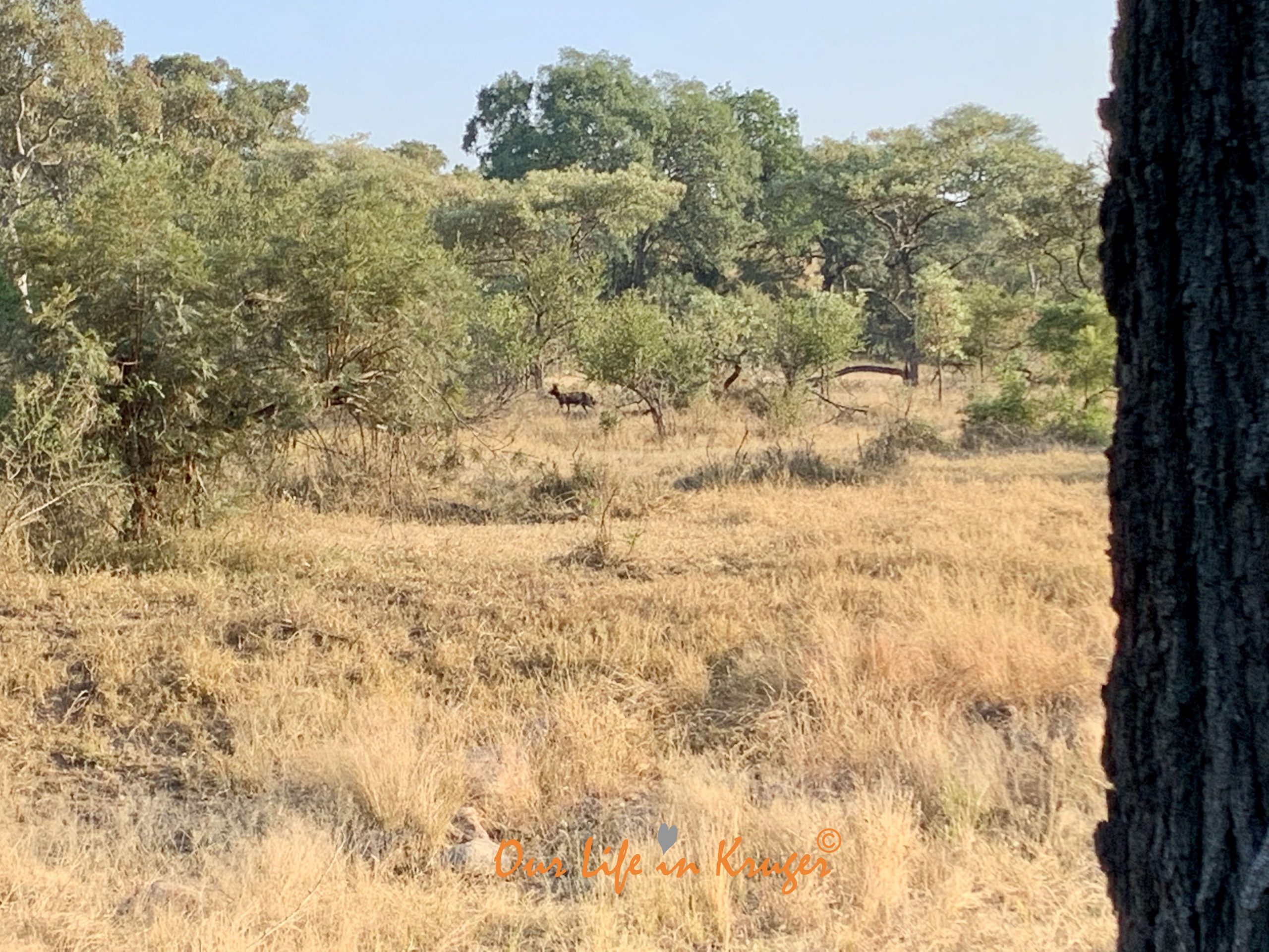 I was still smiling from my funny Francolin encounter when a movement on the other side of the fence caught my eye. It was a wild dog!!! He was trotting past, occasionally stopping to look behind him. There was blood on his face.