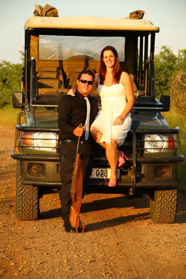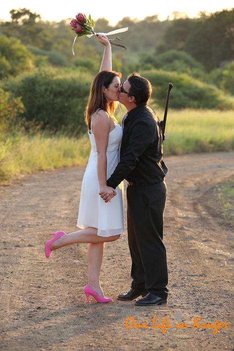 Steven’s very talented brother and sister in law did our wedding photos for us after the ceremony. While the rest of the wedding party were enjoying a glass of sparkling wine on the deck overlooking the Timbavati, we went into the bush for a little photo shoot. Steven’s supervisor had graciously lent him the trail’s Landcruiser and both the cruiser and Steven’s rifle feature in most of our wedding photos. It is just a shame there were no elephants or other game around. That would have completed a perfect day.