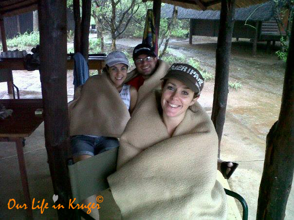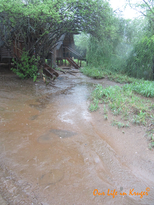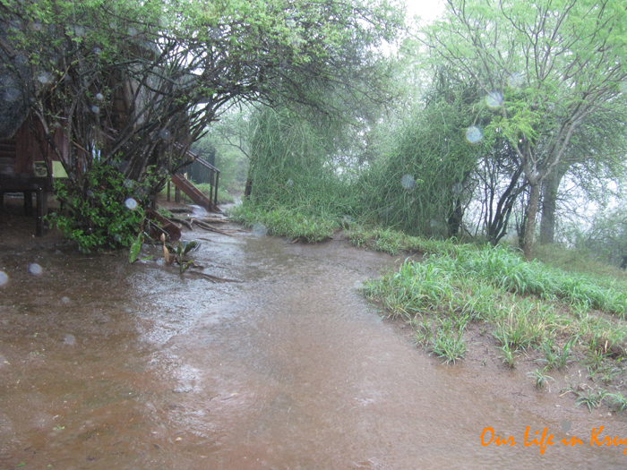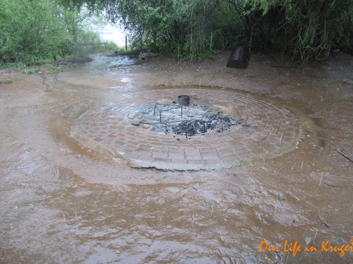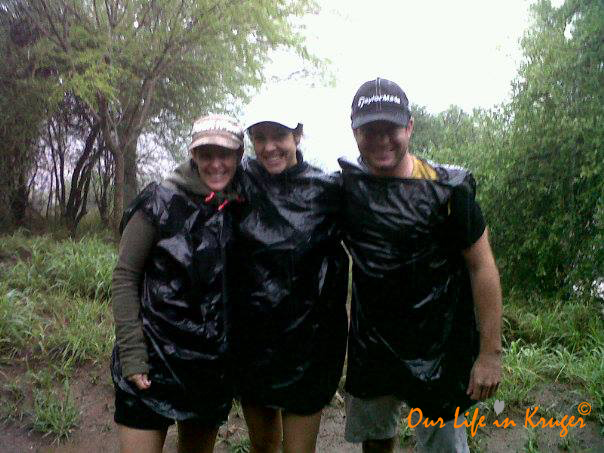 We re-grouped under the Lapa to dry off and come up with a plan, while the pathways in camp turned into little streams and the water was flowing around the fire pit. There was no point in driving through the worst of the storm. So we decided to wait it out. Janine and I made a few ‘raincoats’ out of black bags -boer maak ‘n plan style – by cutting a hole for our heads and two for each arm. That way we could sort of stay dry on Steven’s open Landcruiser when we finally made a dash for ‘safety’ back to Letaba.