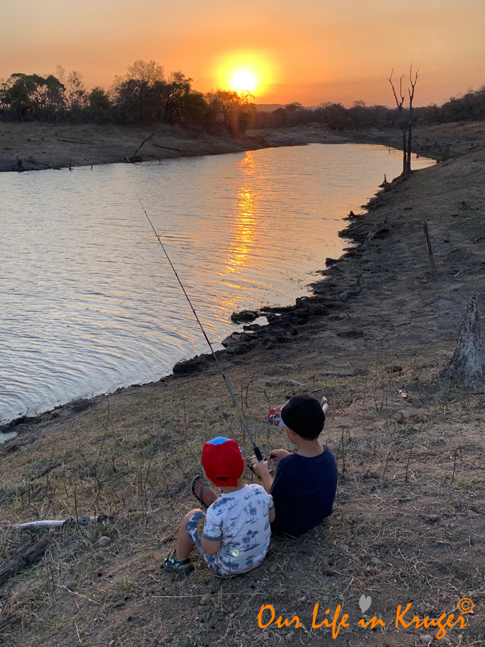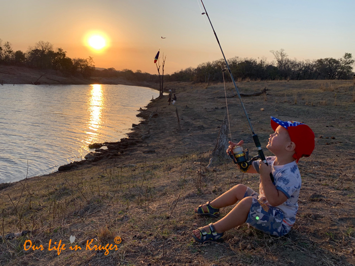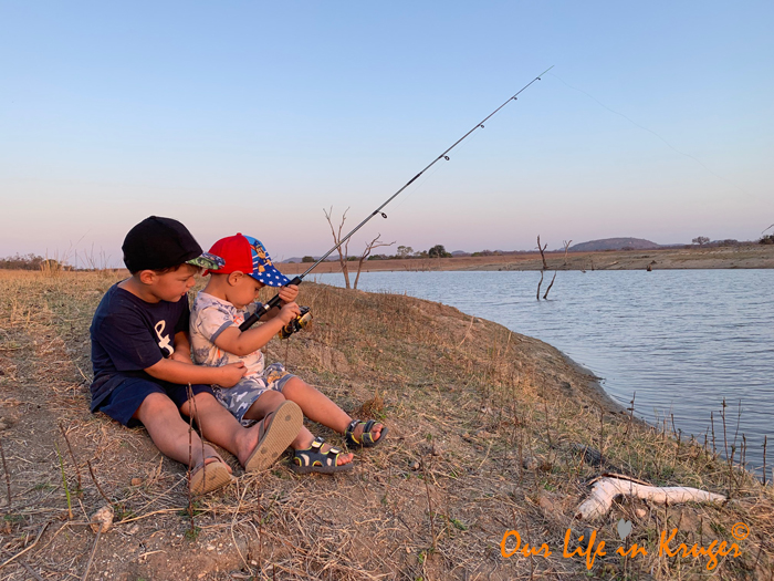 The looks on Alex’ and Jack’s faces were absolutely priceless! Ava and Aiden love fishing too. They are actually quite good at it so they were teaching their younger brothers what to do. They got a few nibbles, but no bites unfortunately. When it was time for Alex and Jack to try, Steven took the hooks of the dobbertjies because they kept getting stuck. Aiden would cast for Jack, who would then feverishly, and with the utmost concentration, wheel the line in. I think he thought the dobbertjie was a fish because he kept yelling: Kyk mamma!! Vissie!!
