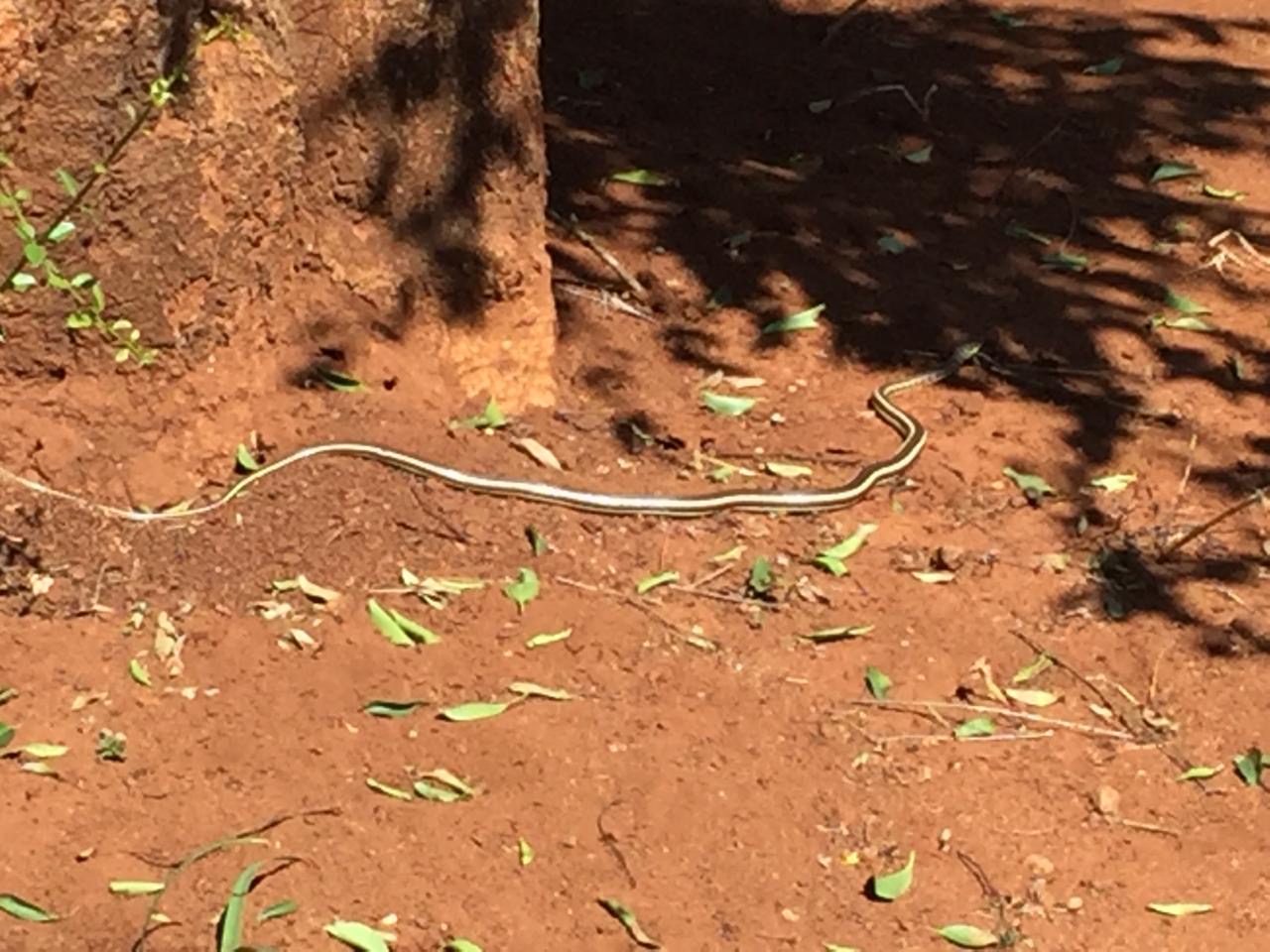 With the skink in its mouth, the snake moved towards the shade underneath the Pride of the Cape at the fence. There, it re-adjusted its grip on the skink a bit and disappeared from view deep into the scrubs.