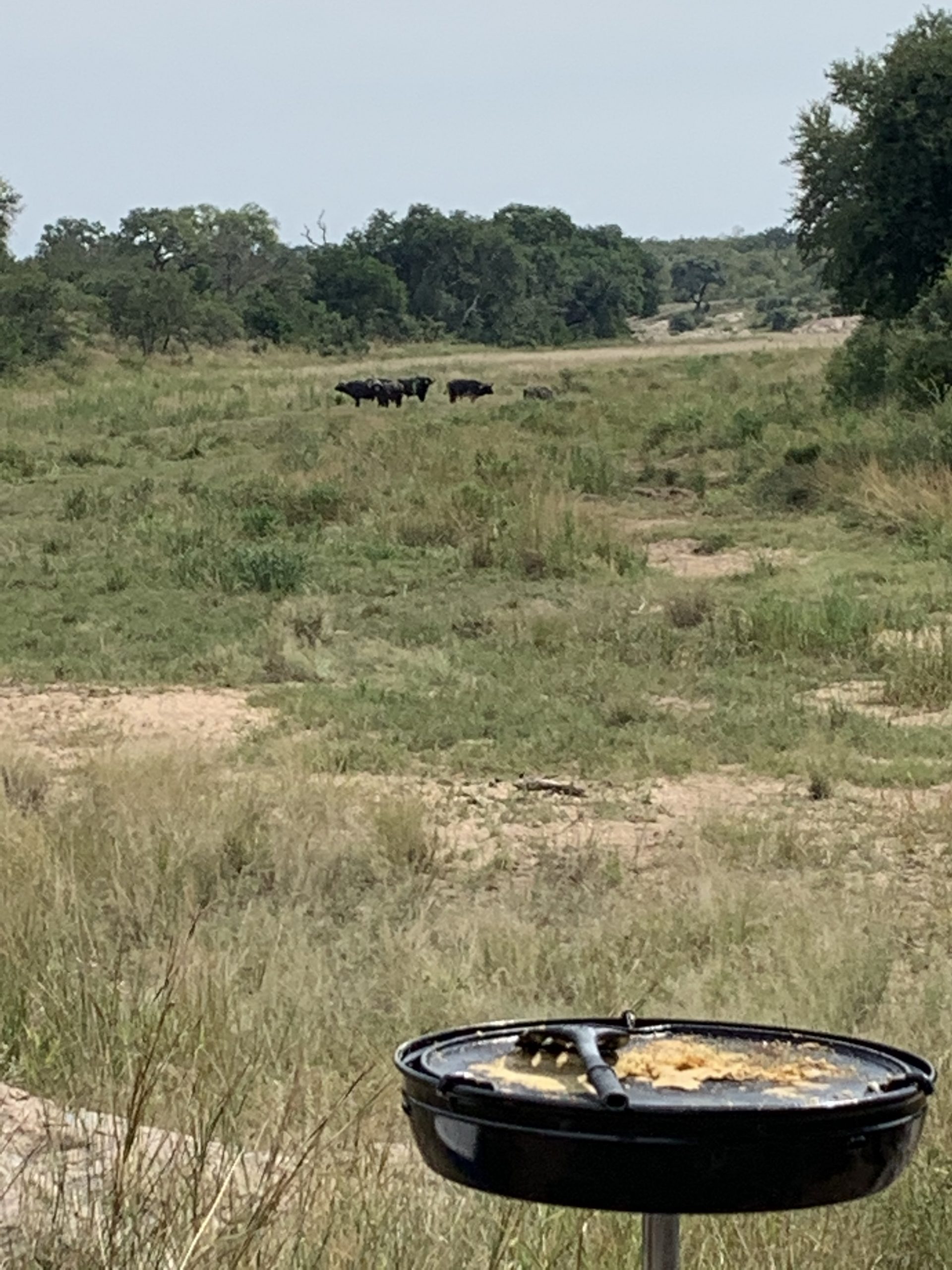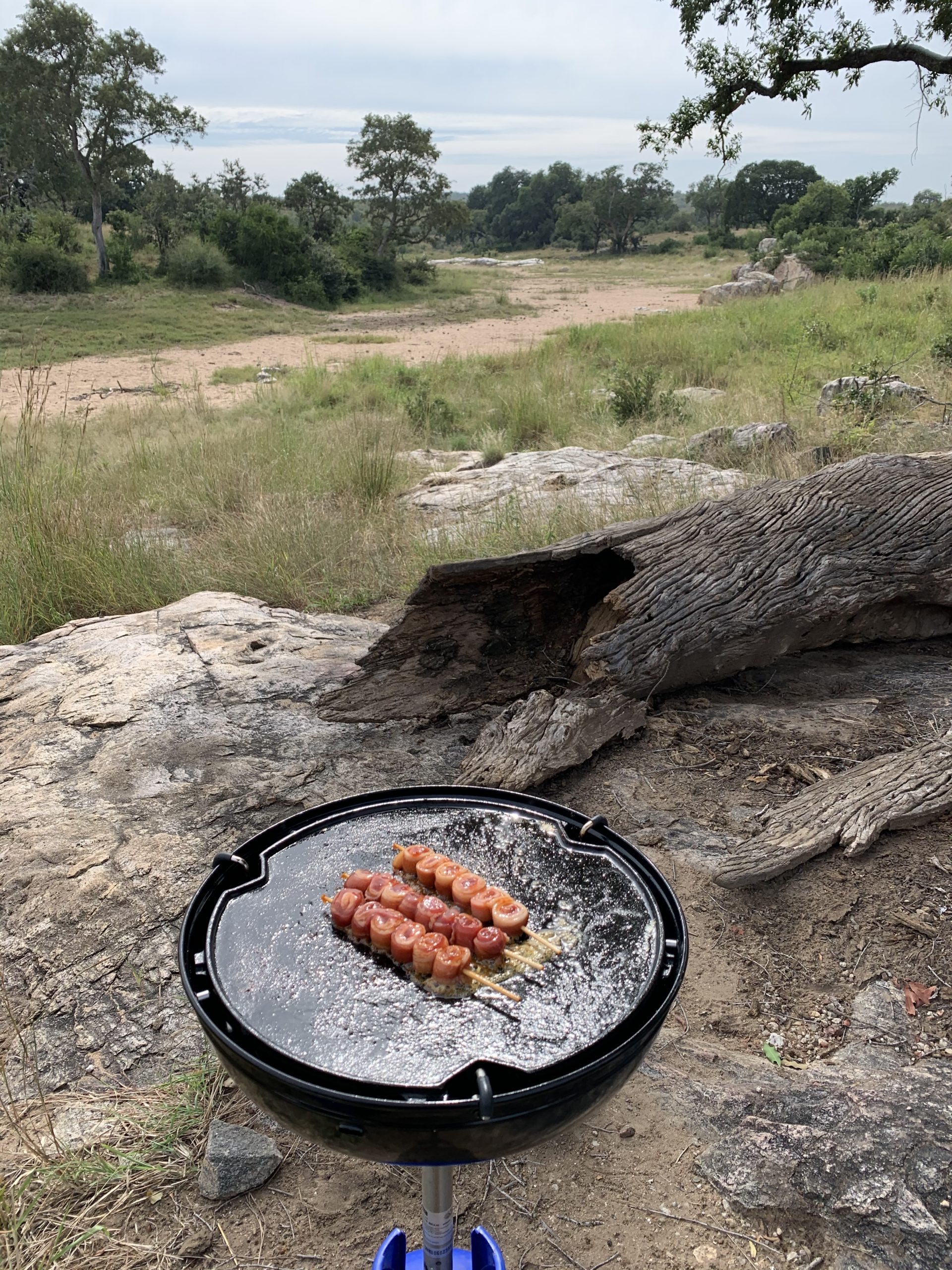Alex and Jack set off to explore their surroundings. They always love being out and about in the wilderness. Steven instructed them to stay on the rocks at all times. We set up the skottel and while our rashers of bacon were sizzling away, a couple of Kudu crossed the dry stream behind the buffalo. What a fantastic way to spend a morning!! We had all been so busy and being out there in the bush is the best way to relax.