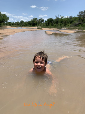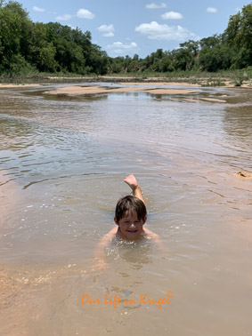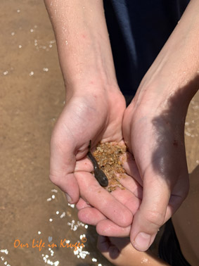 As we approached the water’s edge, a few impala spoor in the mud reminded me that we were not on a beach, but still very much in the wild. The water was flowing slowly and was knee-deep at some places and only ankle-deep at others. And it was surprisingly warm! The kids had an absolute blast catching little tadpoles and running after small fishies that were flowing by. It is still a mystery to me how those fish end up in a stream that only flows after heavy rains.